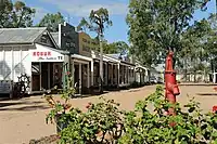 The village has an authentic 1900s era streetscape, featuring a bakery, post office, chemist, general store, Red Rose Cafe, and a branch of the Bank of New South Wales, all featuring real items from the time period. Also included are a church, school, butcher, and blacksmith. A typical slab hut from the early 1900s era is also displayed. The village also hosts the former Dalwogan railway station (part of the Wandoan Branch Railway), with the retired Queensland Government Railways C17 steam locomotive no. 944 on display outside.