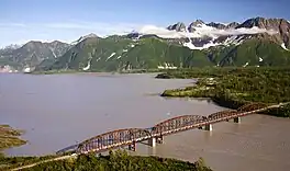 ![]() Aerial view of Miles Lake (left), Miles Glacier Bridge, Copper River (right), and Goat Mountain. | |
