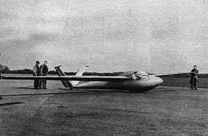 The wooden Crabpot was not built as designed but developed in two forms, differing in their wing construction. The most radical version was that part constructed by Kendall's employer, Miles Aircraft. This, known as the Miles M.76, was undertaken for the British Gliding Association, with financial backing for the project from the Miles company, the Kemsley Flying Trust, and the Ministry of Supply. The design included an experimental wing from by the plastics division of F. G. Miles, Ltd., built from a phenolic/asbestos fibre material stabilized with a paper honeycomb, the manufacturing technique being based on the vacuum moulding process pioneered by the Royal Aircraft Establishment at Farnborough. The 60 ft (18.29 m) span wing was to be made in two semi-span sections each consisting of one 30 ft (9.14 m) moulding, considered to be the largest one-piece moulded phenolic/asbestos structures manufactured at that time.[1] The new wing also had a different section from that of the Crabpot, a laminar flow 6- digit NACA airfoil rather than the original 5-digit one. However, the structure proved much weaker under test than intended and was abandoned.[2]