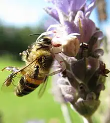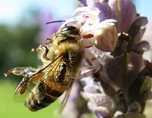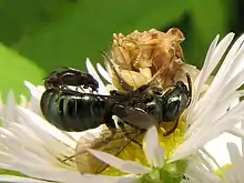 The adults of some species linger close to invertebrate predators, where they act as kleptoparasites, feeding on bodily fluids of the prey. This strategy has given rise to a range of common names such as freeloader flies and jackal flies. The nature of the kleptoparasitism that Milichiidae practise is difficult to detect from direct observation; some observers remark that they seem to lick the prey rather than anything else.[10][11] However, it seems that they get whatever nourishment they can; the accompanying photographs suggest that at least some species penetrate the thinnest cuticle of a bee in a spider's jaws, extracting tissues that enzymes in the venom of the spider have reduced to a fluid state.[12] When extended, the proboscis certainly is long enough for feeding in such a manner.[6]