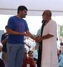 Milind Gadhavi with Morari Bapu at Asmita Parva, Mahuva in April 2015