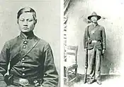 William Ah Hang, a Chinese American, became one of the first Asian Americans to enlist in the U.S. Navy in 1863.[4] In total more than 50 Chinese Americans fought, on both sides, in the Civil War.[2][25] Of those who served, only a handful received recognition of their service in the form of pension, benefits, or citizenship. An exception was Ching Lee, who took the alias Thomas Sylvanus and served in the 81st Pennsylvania Regiment.[25][37]