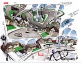 Schafer went into it imagining the world as a giant spider-web surrounding Boyd's house, designed to evoke a "retro, [19]50s spy vibe" in a suburban neighborhood where things were not as they seemed. Art director Scott Campbell wanted paranoia to be a more prominent aspect of the level, which he accomplished by having eyes and binoculars come out of various objects and landmarks whenever players are looking away from them, to create the feeling of being watched. He was also responsible for the G-Men that are found throughout the level, basing them on "G-Man detectives" from the 1950s, as well as the Spy vs. Spy comics. Campbell specifically reminisced about the amusement he found with how conspicuous the Spy vs. Spy characters were with their outfits and behavior, giving the G-Men in "Milkman Conspiracy" a single object as a disguise, and making them use it in a blatantly incorrect fashion. Concept artist Peter Chan visualized the world as suburbia being "vaulted up against the sky," while the roads twisted in the air. He compared it to Boyd's logic and reason, which he described as twisted.[2][1]