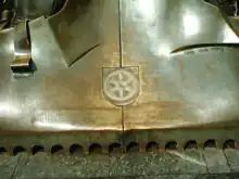 The town’s arms might be described thus: Quartered, first and fourth squares are gules with a wheel of six spokes in argent, second and third squares are argent with the letter M in gules.