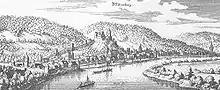 Miltenberg/Miltinburc grew around a Mainz toll station built on the river bank in the 13th century, protected by the Mildenburg (castle). The castle itself dates from the 12th century. In 1237, the village was awarded the status of town. It profited from the Stapelrecht which forced passing merchants to store their wares locally and offer them for sale for some days. This boosted construction of inns and warehouses.[3]: 81 For protection, walls from the castle were extended around the town. This oldest part of the town was just 100 meters east to west, extending west from today's Schnatterloch. The first expansion of the settlement stretched east to the Mittelturm and west to the Schwertfegerturm (both later demolished). By the 14th century, the town had expanded to the limits which roughly endured until the 19th century: from Würzburger Tor (east) to Spitzenturm/Mainzer Tor (west).[4]: 85
