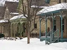 The Milwaukee Avenue Historic District is a historic district in the Seward neighborhood of Minneapolis. The district comprises two city blocks of small homes on quarter-sized lots. These houses were built between 1884 and 1890 by William Ragan, a Minneapolis real estate speculator. Built for lower-income residents, the houses had deteriorated in condition by the end of World War II, and by the 1970s, were planned for demolition. A group of residents and concerned citizens fought to save the houses, eventually leading to their inclusion on the National Register of Historic Places and the federal protection and rehabilitation that comes with the designation. Today, the houses sit along a bike- and pedestrian-friendly mall on which motor traffic is prohibited.[3]