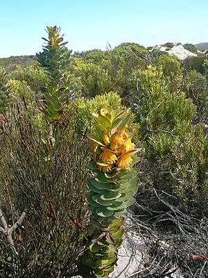 Mimetes saxatilis or limestone pagoda is an evergreen, upright, rarely branching shrub of 1–2¼ m (3⅓–7¼ ft) high, assigned to the family Proteaceae. The approximately oval leaves are 3½–5 cm (1.4–2.0 in) long and 1½–3 cm (0.6–1.2 in) wide with a blunt, thickened, reddish tip or with three crowded teeth. It has cylinder-shaped inflorescences topped by a crest of green leaves, further consisting of heads with 12-22 individual bright yellow flowers, each in the axil of a flat, green leaf. It is an endemic species that is restricted to limestone outcrops in the Agulhas plains in the very south of the Western Cape province of South Africa. It is considered an endangered species. Flowering may occur between July and December, but is unreliable in its timing, dependent on sufficient moisture availability.[3]