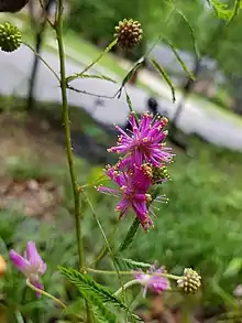 It is a sprawling, herbaceous plant with alternate leaves. Each leaf is compound with up to 16 pairs of leaflets that fold together when touched. The stem is covered with small recurved prickles. The flowerheads comprise round clusters of numerous pink flowers, each flower only 3 mm (0.12 in) long with exserted stamens. The fruits are also prickly. Flowering occurs from May through September.[4]