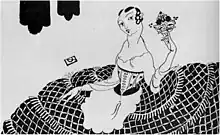 Around the age of eighteen, Loy convinced her parents to allow her to continue her education in Paris with a chaperone – a woman called Mrs. Knight.[14] After much persuasion, she was allowed to move to Montparnasse, which in 1902 had not yet been urbanised, and attend the Académie Colarossi as an art student.[15] Unlike the segregated classes at the Munich Künstlerinnenverein, these art classes were mixed. It was here, through an English friend of a similar social standing named Madeline Boles, that Loy first came into contact with the English painter Stephen Haweis who Loy later described as enacting the "parasitic drawing-out of one's vitality to recharge, as it were, his own deficient battery of life."[16] According to Burke's biography, Haweis was unpopular with his fellow students, being considered a "poseur," and Boles in particular took him under her wing.[16] Haweis, whose father was the well-known Reverend H.R. Haweis and his mother Mary Eliza Haweis a writer who wrote, amongst other things, Chaucer for Children: A Golden Key, was an aesthete of sorts and "despite being very short[,] he managed to condescend to his listeners from a height."[16] He began to exert himself over Loy, recognising her beauty and desirability, and played the role of the misunderstood eccentric which led Loy to feel guilty for disliking him and distrusting him as he borrowed more and more money from her without paying her back. Later she would reflect that Haweis loomed over her and she became, in Loy's own words, "as sullenly involved as with my mother's sadistic hysterics."[17] One night he convinced her to stay over and, in what she would later describe as a state of hypnosis, she was seduced by him. Waking up next morning in his bed, semi-naked, Loy was horrified and repulsed.