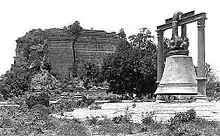 The Mingun Bell was knocked off its supports as a result of a large earthquake on 23 March 1839. It was resuspended by the Irrawaddy Flotilla Company in March 1896 using screw jacks and levers using funds from public subscription.[4] Felice Beato captured a photograph of the bell prior to its resuspension.