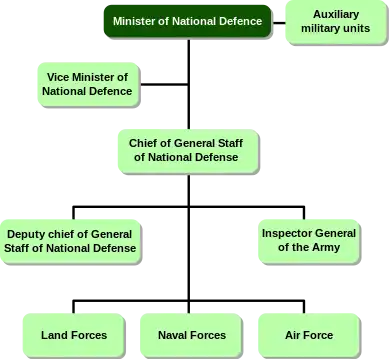 The ministry is headed by the Minister of National Defence, who reports to the President of Guatemala, the commander in chief of the armed forces.