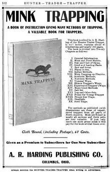 Mink Trapping is an American reference book focused on the trapping of mink, a mammal with valuable fur. It was published on August 6, 1906. It is part of the collection Harding's Pleasure & Profit Books. The book is a collection of mink trapping instructions and tips from the author and other trappers in the United States and Canada, including photographs and illustrations. The book gives information on where and how to set traps for mink, including land, water, blind sets, baits and scent to use, methods in Northern and Southern states, and size and care of skins.[1][2]