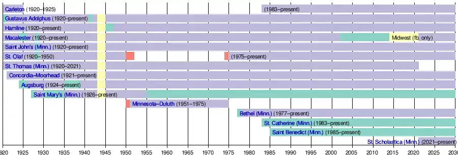 On May 22, 2019, it was announced that the University of St. Thomas would depart the MIAC at the end of spring 2021. St. Thomas by this point had over twice the enrollment of any other member institution.[2] and on May 28, 2020, the conference announced the addition of the College of St. Scholastica after leaving the Upper Midwest Athletic Conference in 2021.[3]
