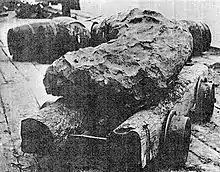 The mine produced some large nuggets of copper; the first, in 1874, was a 5720-pound nugget which was subsequently displayed on the courthouse lawn in Detroit and at the 1876 Centennial Exhibition.[12] This copper mass showed evidence of being worked by prehistoric miners, "the surface of the mass had evidently been beaten up into projecting ridges... depressions, several inches deep, and the intervening elevations, with their fractured summits, covering every foot of the exposed superficies."[13] In 1878, a copper mass weighing six tons was discovered, and in 1879 two nuggets of 3317 and 4175 pounds were discovered.[12]