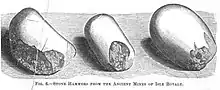 When re-discovered in the 19th century, the prehistoric excavations in the Minong Mine area were described as extending "in almost a continuous line for more than two miles, in most instances the pits being so close together as barely to permit their convenient working."[8] A number of ancient mining artifacts were collected from the Minong site; primarily smooth cobbles used as hammers which were, it was said "collected by the cartload."[7] In addition, a fragment of a wooden bowl about three feet across, a wooden shovel, and a rawhide string were also discovered at the site.[7]