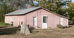 It is a one-story building with a gabled rectangular section about 48 by 19 feet (14.6 by 5.8 m) with 2-foot-thick (0.61 m) sod brick walls, plus a 16-by-10-foot (4.9 by 3.0 m) wood-frame lean-to section, all covered by a corrugated, galvanized metal roof. The exterior is cement and stucco in the two sections.[2]