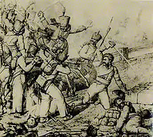 Prince Wrede halted at Nancy, to await the arrival of the Austrian and Russian corps. Upon his right Lieutenant General Czernitscheff crossed the Moselle, on 29 June, within sight of Metz; and carried by storm, on 3 July, the town of Châlons-sur-Marne. The garrison of this place had promised to make no resistance, and yet fired upon the Russian advanced guard; whereupon the cavalry immediately dismounted, scaled the ramparts, broke open the gates, sabred a part of the garrison, made the remainder prisoners, including the French General Rigault, and pillaged the town.[24]