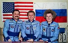 Mir EO-21 was a long-duration mission aboard the Russian Space station Mir, which occurred between February and September 1996. The crew consisted of two Russian cosmonauts, Commander Yuri Onufrienko and Yury Usachov, as well as American astronaut Shannon Lucid. Lucid arrived at the station about a month into the expedition, and left about a week following its conclusion; NASA refers to her mission as NASA-2.[4] She was the second American to have a long-duration stay aboard Mir, the first being Norman Thagard, as a crew member of Mir EO-18; he stayed on the station for 111 days.[5] Some sources refer to her mission as Mir NASA-1, claiming that she was the first American to have a long-duration stay aboard Mir.[6]