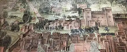 In the 15th century, with Gian Galeazzo's son Filippo Maria Visconti, a Park Official (later named Captain of the Park) with administrative headquarters in Mirabello began to appear in the documents.[6] Galeazzo Sanseverino inherited Mirabello probably in 1494, on the death of Duke Gian Galeazzo Sforza. He renovated the castle between 1501 and 1522, enlarging its western wing and adding the balcony with a masonry parapet.[4] The King of France, the Duke of Alençon (brother-in-law of Francesco I), and Galeazzo Sanseverino himself (Grand Squire of France since 1505) stayed in the building in the months preceding the battle of 24 February 1525, during which Galeazzo died like many other nobles of the French army. [7]