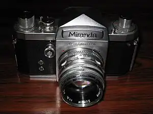 The Miranda cameras were equipped with a double lensmount consisting of a wide 44mm internal thread and an external bayonet—the Pentax/Praktica screw mount is 42mm. The flange to film plane distance was deliberately made as short as possible to accommodate as many different makes of camera lenses as possible using separately-sold lens adapters. The detachable finder prism was set in a sliding mount. The lenses for the Miranda were at first supplied by either Zunow or Ofunar. However, by the end of the 1950s, Soligor became the main supplier, and soon the lenses were labelled Auto Miranda.[3]