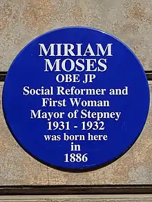 Miriam Moses OBE JP (13 November 1884 — 24 June 1965) was a British Liberal politician, philanthropist and social reformer. She served as the first female mayor of Stepney, and the first female Jewish mayor in the United Kingdom.