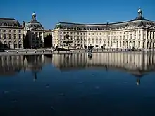 The Miroir d'eau (Water Mirror) in Bordeaux is the world's largest[1] reflecting pool, covering 3,450 square metres (37,100 sq ft). Located on the quay of the Garonne in front of the Place de la Bourse, it was built in 2006.[1]