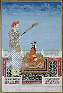 Mirza Salim (seated) while Tabiriyat Khan waving the fan