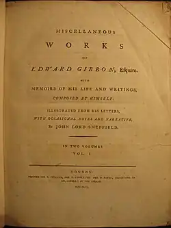 - ↑ the full title of 1796 (and in square brackets, that of 1814) is, [The] Miscellaneous Works of Edward Gibbon, Esquire; [Esq.] with Memoirs of his Life and Writings, composed by himself.[:] Illustrated from his Letters, with occasional notes and narrative, by [the Right Honourable] John, Lord Sheffield. in Two Volumes [a New Edition, with Considerable Additions in Five Volumes].