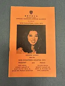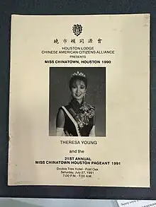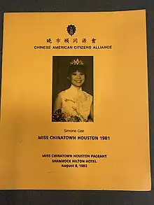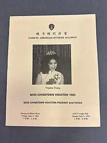 - ↑ "Houston Lodge Chinese American Citizens Alliance Miss Chiantown Houston Pageant 1984".