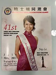 - ↑ ""Houston Lodge CHinese American Citizens Alliance 46th Annual Miss Chinatown Houston Scholarship Pageant 2016"".