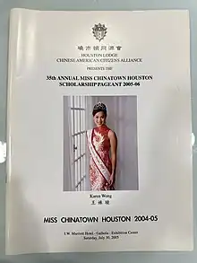 - ↑ "Houston Lodge Chinese American Citizens Alliance 30th Annual Miss Chinatown Houston Pageant Program". 2000.