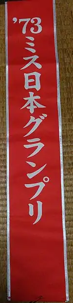 - ↑ 【Japanese news articles】実際、1990年代初めごろまでは、グランプリ決定大会に参加した方々全員はステージ登壇時に赤地・白の文字と縁取りの「ミス日本」と書かれたたすきを掛けてグランプリ決定大会に出席していた。現在は決定大会審査中はたすきを掛けていないが、各賞の受賞者が決定後、その受賞した賞が書かれたたすきを審査員から掛ける(したがって1990年代初めごろまでは「ミス日本」のタスキと、各賞のタスキの2枚をかけてもらっていた)。各賞受賞者のうち、グランプリを含めた多くの賞受賞者は赤地・白の文字と縁取り(右の写真)、「海の日」は白地・青の文字と縁取り、「水の天使」は白地・水色の文字と縁取り、「みどりの女神」は白地・緑の文字と縁取り、「空の日」は青地・白の文字と縁取りでそれぞれの賞のたすきが掛けられる(国外でのプロモーションである場合は先述の赤地・白い縁取りと文字で、ローマ字の 「MISS JAPAN」 など、その表敬先の国・地域の言語に沿ったタスキをつける場合もある)。ミス日本出席の公式行事においては受賞した賞のタスキを掛けて参列する(特別顕彰受賞者も含む)。なお特別顕彰を受賞した畠山と南谷は受賞タイトルが記載されていない、汎用のタスキ(受賞年度と「ミス日本」、後ろには「MISS JAPAN」とのみ書かれている)が贈呈された(ミス日本公式サイト掲載写真・デイリースポーツ掲載写真)この他、受賞者には公式行事に使用するティアラ、グランプリ受賞者には王冠とガウンに代わる高級打ち掛けが受賞記念品として贈られる。