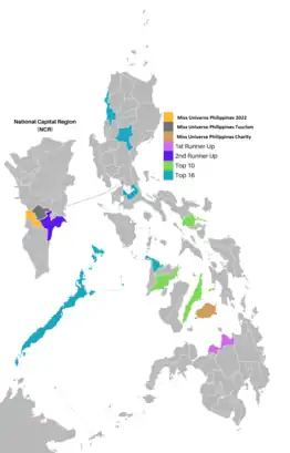 The Philippine map results of Miss Universe Philippines 2022, colors shaded in each province/cities.