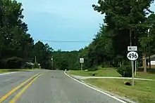 MS 496 starts at a three-way intersection with MS 19 near Meridian, and the route travels eastward through rural, forested Lauderdale County.[5] The road begins to turn northeast past Old Wire Road and Whitaker Road, and it crosses Cokers Branch near Harper Road.[3] At KOA Campground Road, MS 496 begins traveling southeastward.[5] The route then intersects Russell–Mount Gilead Road and Linton Road, which travel to Russell and Vimville respectively. MS 496 enters the unincorporated area of Alamucha near Alamucha–Whynot Road, and starts traveling northeastwards again east of Greenhill Road.[3] Near the Alabama–Mississippi state line, the road intersects T.K. Culpepper Road, a county-maintained state highway with the designation of MS 897.[6] MS 496 crosses the state line past Salem Church Road, and it continues as Sumter County Route 1, which continues northeastwards towards the town of Cuba.[5]