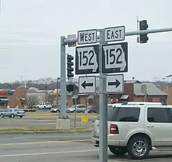 Route 152 is a state highway in the northern Kansas City metropolitan area. It begins at Interstate 435 south of the Kansas City International Airport and ends at Route 291 in Liberty. The route is a limited access highway between its two junctions with I-435. It crosses I-29 five miles (8.0 km) south of the airport in Platte County and US 169 in Clay County.