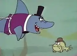 Misterjaw (voiced by Arte Johnson) was a blue-colored great white shark (who wore a purple vest with white collar, a black bow tie and black top hat) who liked to leap out of the water and shout "HEEGotcha!" or "Gotcha!" at unsuspecting folks who would run off in terror. He spoke with a German accent and was known to mispronounce words, such as "knucklehead" pronounced as "ka-nucklehead". He also had a sidekick, a green-scaled, brown bowler hatted Brooklyn-accented catfish named Catfish (voiced by Arnold Stang) who usually referred to Misterjaw as "Boss" or "Chief"; Misterjaw usually called Catfish either "pal-ly", "fella" or "sonny" when in a good mood, or names like "dumbkoff", "ka-nucklehead" or "macaroni brain" when irritated.[2] At times, Misterjaw would mistakenly address his sidekick as "Dogfish", only to correct himself a split second later by saying "I mean, Catfish".