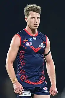 In his eighth AFL match, he kicked three goals and recorded fourteen disposals and five marks in the fourteen point loss to North Melbourne at the Melbourne Cricket Ground in round nine to be named in AFL Media's team of the week.[16] He played every match until the round twenty game against Greater Western Sydney at UNSW Canberra Oval,[17] before returning for the last three matches of the year to finish with twenty games in total in his debut season.[18] At the end of the season, he was the Melbourne nominee for the AFL Players Association (AFLPA) best first year player award[19] and finished fourteenth in Melbourne's best and fairest with 216 votes.[20]