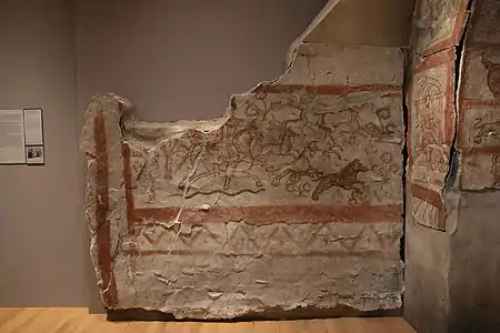 Mareos (or Mareinos) was a painter known by his signature in the mithraeum. The paintings there are dated to the middle of the third century AD. The short inscription reads: "For the salvation of Mareos, the painter (Νάμα Μαρέῳ ζωγράφῳ)".[19] The paintings in the mithraeum are relatively well preserved, but are described by most modern authors as not of particularly high quality. He may have been a local artist with limited skills. With a foreign painter one would expect a better quality of the work. Mareos is blessed in the short inscription, using the word namais. This word is of Persian origin and is often used in the Mithras cult as a particularly solemn blessing formula in the sense of "for salvation...".[20] So Mareos was very likely a follower of Mithraism.[21]