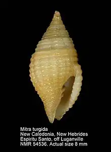 Mitra turgida is a species of sea snail, a marine gastropod mollusk in the family Mitridae, the miters or miter snails.[1]