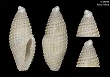 Original description: "Shell ovate, biconical, rather slender. The length of the narrow aperture is equal to the height of the spire. Protoconch of two and a half plain white whorls. The apex is wide and dome shaped, with an unrolled tip. Teleoconch of 4 whorls. Sculpture is made up of strong, flat-topped, widely spaced spiral cords, 3 on the whorls of the spire and 15 on the body whorl. They are crossed by slightly smaller axial ribs, 24 per whorl. Each crossing point is marked by a small bead. As a result the whole shell has a cancellate granulose appearance. The columella has two folds. The outer lip 8 denticles. Sinus with distinct subsutural channel. Colour is white to creamy white, some specimens with pale brown badly delimited blotches. The holotype measures 3.1 mm in height and 1.3 mm in width. The species is fairly constant, adult size varying only from 3.1 to 3.8 mm."[2]