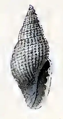 (Original description) This small, slightly fusiform species is remarkable for the peculiar truncate apex, the pleurotomoid labral sinus, and the columellar plaits being two only in number. Its color is white, sometimes rose-tinged. The shell contains 6 slightly convex whorls, including 2 vitreous whorl in the protoconch. The 16 longitudinal ribs and the transverse lirae (5–6 in the penultimate whorl, 18–20 in the body whorl) are produced into acute nodules at the points of intersection. The small aperture is narrow. The outer lip is slightly incrassate, distinctly sinuate and shows about six small denticles inside. The wide siphonal canal is very short. The columella is slightly oblique and shows two tubercles in the middle.[2]