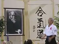 At the age of 16, Mitsugi Saotome began his martial arts training in judo. At the age of 18, he entered the Aikikai Hombu Dojo in Tokyo in order to train under Ueshiba. Records provided personally from Kisshomaru Ueshiba, to the Saotome family from Hombu Dojo, detail a first degree black belt in 1957, and second degree black belt in 1958.[3] Kisshomaru Ueshiba goes on to confirm that Mitsugi Saotome became an uchi-deshi (personal apprentice or disciple) to Morihei Ueshiba in April 1959, receiving subsequent promotions to sixth degree black belt (Shihan) in January 1968, and remained uchi-deshi until the founder's death in April 1969.[3] Mitsugi Saotome trained at Hombu Dojo for a total of 15 years.[4][5]