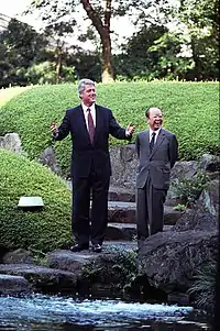 Miyazawa became Prime Minister on 5 November 1991 backed by his faction.[7] Miyazawa gained brief fame in the United States when President George H. W. Bush vomited in his lap and fainted during a state dinner on 8 January 1992.