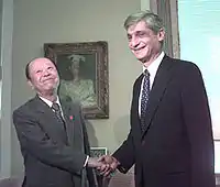 Miyazawa later returned to frontbench politics when he was once again appointed finance minister from 1998 to 2001 in the governments of Keizō Obuchi and Yoshirō Mori. In 1998, Miyazawa replaced Hikaru Matsunaga as finance minister.[8][9] He served a total of 14 terms in both upper and lower houses before retiring from politics in 2003.[2][10] The reason for his retirement was that then prime minister Junichiro Koizumi set an age limit of 73 for LDP political candidates.[11]