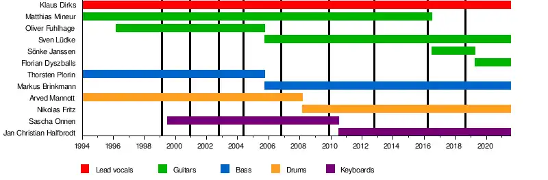 Among the Gods, arrived in May 2004 through SPV. Guitarist Oliver Fuhlhage was replaced by Sven Lüdke of Murder One in October as the band geared up for European dates supporting Europe. The band recorded a live album and DVD, billed Signs of the Time LIVE, at a hometown gig at the Wilhelmshaven Pumpwerk.
