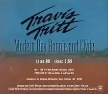 "Modern Day Bonnie and Clyde" is a song written by Walt Aldridge and James LeBlanc, and recorded by American country music artist Travis Tritt. It was released in January 2002 as the fourth and final single from his album Down the Road I Go. It peaked at number 8, and is his last top ten hit to date.