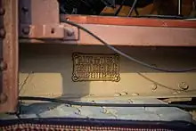 A golden sign in the Hungarian language placed on the bottom of a historic wagon