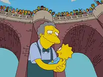 The whole town goes to the Springfield Botanical Gardens to see the blooming of a Sumatran Century Flower. Because the huge crowd is exactly one person over the maximum legal capacity, Chief Wiggum decides to eject the most bitter and unpopular person there from the ceremony: Moe. However, when the flower opens, it emits a horrible smell, sickening the townspeople and destroying the entire garden. When the townspeople start to drive away from the Botanical Gardens, the Simpsons become trapped in a traffic jam. Lisa tries to warn Homer that the traffic is moving, but he accelerates too hard and hits the brakes suddenly. The force sends Maggie flying through the sunroof after her cheaply made safety belt breaks. Moe, who is getting ready to leap to his death from a ledge, accidentally catches Maggie just as she is about to fall into the river below the bridge. Moe is then instantly declared a hero, much to his surprise, and he instantly bonds with Maggie.