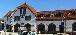 The first station of Moers was east of the present station on the line from the Ruhrort–Homberg train ferry to Moers, which opened in 1883.[6] The station was moved to its present location between 1904 and 1908.[4] The line to Homberg was closed in 1908[6] and replaced by a tram line.