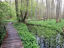 The next points of interest along the trail include the old watermill, which today also houses a restaurant, and the ruin of a long barrow. The route then leads into the ancient woodland, the forest swamp, which is crossed on a footbridge. Among the Red Alders are tussocks rich in herbs. The trail continues through The Prehistoric Forest, which the museum planted in 1964 to illustrate the ecological succession in the forests of Denmark from the Stone Age until today. Thus the forest is divided into the periods Birch and Pine period (9550–8250 BC), Hazel and Pine (8250–7500 BC), Early Lime (7000–3800 BC), Late Lime (3800–700 BC) and Beech (700 BC – today).[17] The trail exits the Beech period close to the beach.